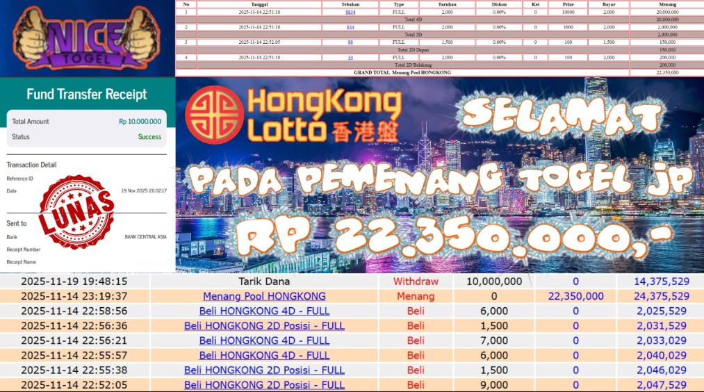 Selamat kepada User id : BEBE**** Telah berhasil mendapatkan kemenangan besar pada permainan JACKPOT TOGEL HONGKONG LOTTO Dengan kemenangan Sebesar Rp. 22.350.000,- Setelah mengisi formulir withdraw dengan kurung waktu hanya 5 – 10 menit pihak NICETOGEL sudah melakukan transfer kepada pemilik Userid dan dana sudah dapat di cairkan oleh pemenang. Bukti pembayaran yang kami berikan merupakan bukti pembayaran yang SAH / VALID yang langung di dapatkan melaui tanda transfer transaksi dari Bank yang di tuju.