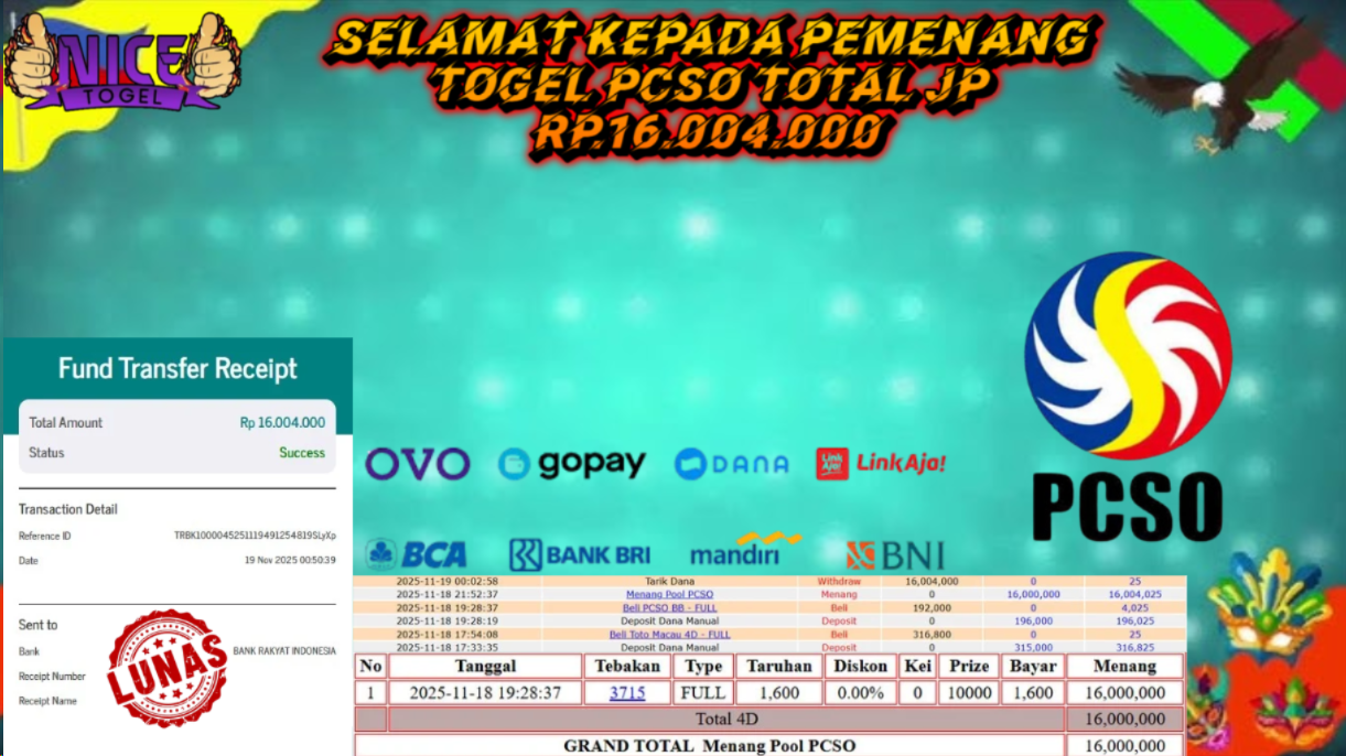 Selamat kepada User id : GAGA**** Telah berhasil mendapatkan kemenangan besar pada permainan JACKPOT TOGEL PCSO Dengan kemenangan Sebesar Rp.16.004.000,- Setelah mengisi formulir withdraw dengan kurung waktu hanya 5 – 10 menit pihak NICETOGEL sudah melakukan transfer kepada pemilik Userid dan dana sudah dapat di cairkan oleh pemenang. Bukti pembayaran yang kami berikan merupakan bukti pembayaran yang SAH / VALID yang langung di dapatkan melaui tanda transfer transaksi dari Bank yang di tuju.