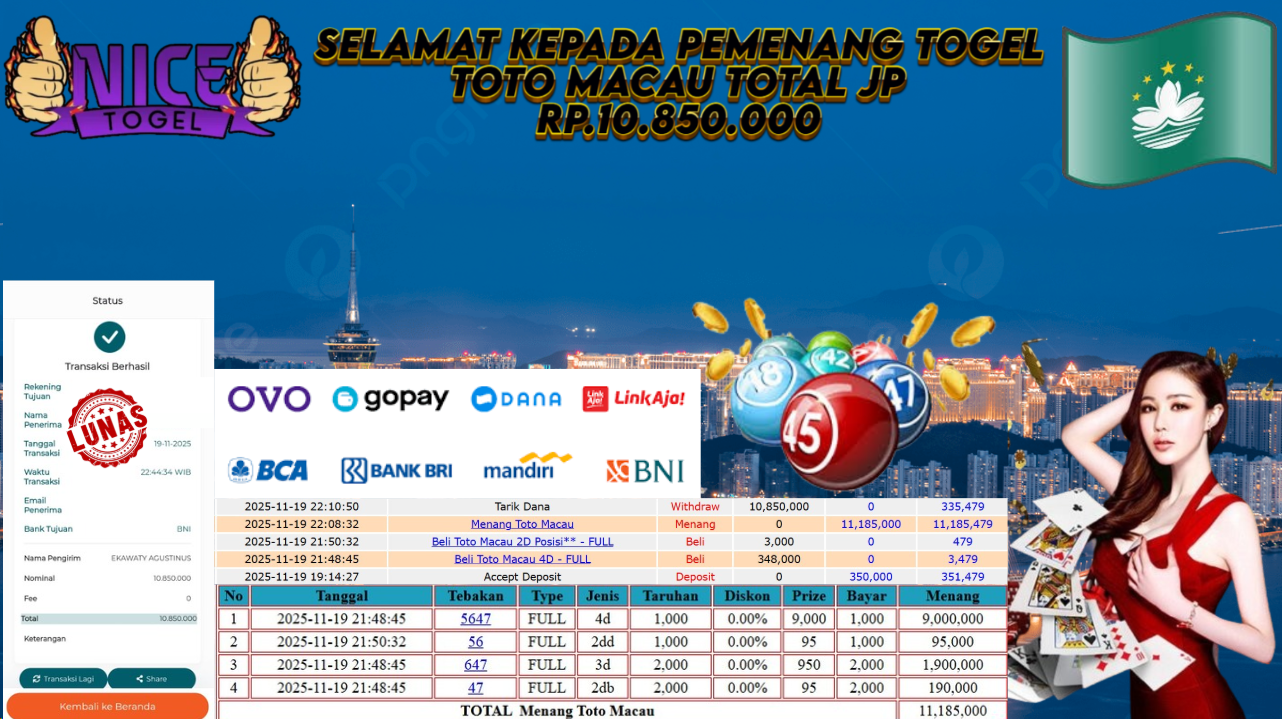 Selamat kepada User id : JAJA**** Telah berhasil mendapatkan kemenangan besar pada permainan JACKPOT TOGEL TOTMACAU Dengan kemenangan Sebesar Rp. 10.850.000,- Setelah mengisi formulir withdraw dengan kurung waktu hanya 5 – 10 menit pihak NICETOGEL sudah melakukan transfer kepada pemilik Userid dan dana sudah dapat di cairkan oleh pemenang. Bukti pembayaran yang kami berikan merupakan bukti pembayaran yang SAH / VALID yang langung di dapatkan melaui tanda transfer transaksi dari Bank yang di tuju.