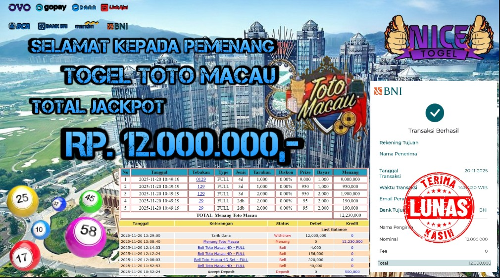 Selamat kepada User id : JUNR**** Telah berhasil mendapatkan kemenangan besar pada permainan JACKPOT TOGEL TOTMACAU Dengan kemenangan Sebesar Rp. 12.000.000,- Setelah mengisi formulir withdraw dengan kurung waktu hanya 5 – 10 menit pihak NICETOGEL sudah melakukan transfer kepada pemilik Userid dan dana sudah dapat di cairkan oleh pemenang. Bukti pembayaran yang kami berikan merupakan bukti pembayaran yang SAH / VALID yang langung di dapatkan melaui tanda transfer transaksi dari Bank yang di tuju.