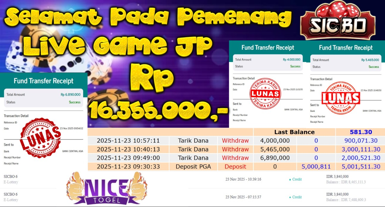 Selamat kepada User id : MARA**** Telah berhasil mendapatkan kemenangan besar pada permainan JACKPOT LIVE GAME SIC-BO Dengan kemenangan Sebesar Rp. 16.355.000,- Setelah mengisi formulir withdraw dengan kurung waktu hanya 5 – 10 menit pihak NICETOGEL sudah melakukan transfer kepada pemilik Userid dan dana sudah dapat di cairkan oleh pemenang. Bukti pembayaran yang kami berikan merupakan bukti pembayaran yang SAH / VALID yang langung di dapatkan melaui tanda transfer transaksi dari Bank yang di tuju.