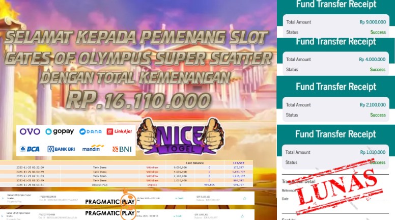 Selamat kepada User id : DIN**** Telah berhasil mendapatkan kemenangan besar pada permainan JACKPOT LIVE SLOT GATES OF OLYMPUS SUPER SCATTER Dengan kemenangan Sebesar Rp. 16.110.000,- Setelah mengisi formulir withdraw dengan kurung waktu hanya 5 – 10 menit pihak NICETOGEL sudah melakukan transfer kepada pemilik Userid dan dana sudah dapat di cairkan oleh pemenang. Bukti pembayaran yang kami berikan merupakan bukti pembayaran yang SAH / VALID yang langung di dapatkan melaui tanda transfer transaksi dari Bank yang di tuju.