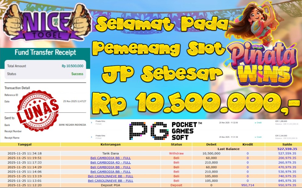 Selamat kepada User id : OMCO**** Telah berhasil mendapatkan kemenangan besar pada permainan SLOT PINATA WINS Dengan kemenangan Sebesar Rp. 10.500.000,- Setelah mengisi formulir withdraw dengan kurung waktu hanya 5 – 10 menit pihak NICETOGEL sudah melakukan transfer kepada pemilik Userid dan dana sudah dapat di cairkan oleh pemenang. Bukti pembayaran yang kami berikan merupakan bukti pembayaran yang SAH / VALID yang langung di dapatkan melaui tanda transfer transaksi dari Bank yang di tuju.