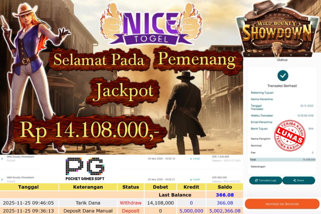 Selamat kepada User id : jida**** Telah berhasil mendapatkan kemenangan besar pada permainan SLOT WILD BOUNTY SHOWDOWN Dengan kemenangan Sebesar Rp. 14.108.000,- Setelah mengisi formulir withdraw dengan kurung waktu hanya 5 – 10 menit pihak NICETOGEL sudah melakukan transfer kepada pemilik Userid dan dana sudah dapat di cairkan oleh pemenang. Bukti pembayaran yang kami berikan merupakan bukti pembayaran yang SAH / VALID yang langung di dapatkan melaui tanda transfer transaksi dari Bank yang di tuju.