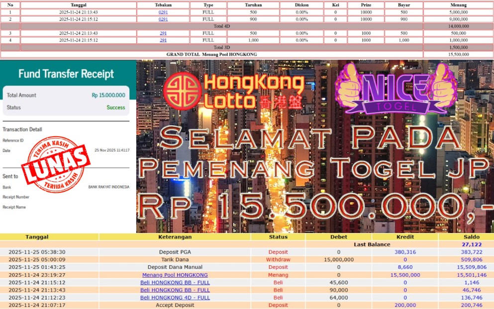 Selamat kepada User id : HAR**** Telah berhasil mendapatkan kemenangan besar pada permainan TOGEL HONGKONG LOTTO Dengan kemenangan Sebesar Rp. 15.500.000,- Setelah mengisi formulir withdraw dengan kurung waktu hanya 5 – 10 menit pihak NICETOGEL sudah melakukan transfer kepada pemilik Userid dan dana sudah dapat di cairkan oleh pemenang. Bukti pembayaran yang kami berikan merupakan bukti pembayaran yang SAH / VALID yang langung di dapatkan melaui tanda transfer transaksi dari Bank yang di tuju.