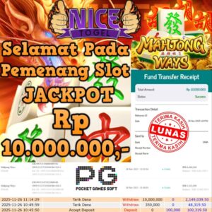 Selamat kepada User id : AGUGU**** Telah berhasil mendapatkan kemenangan besar pada permainan SLOT MAHJONG WAYS Dengan kemenangan Sebesar Rp. 10.000.000,- Setelah mengisi formulir withdraw dengan kurung waktu hanya 5 – 10 menit pihak NICETOGEL sudah melakukan transfer kepada pemilik Userid dan dana sudah dapat di cairkan oleh pemenang. Bukti pembayaran yang kami berikan merupakan bukti pembayaran yang SAH / VALID yang langung di dapatkan melaui tanda transfer transaksi dari Bank yang di tuju.