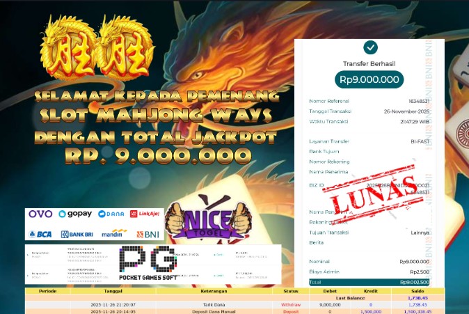 Selamat kepada User id : UDIN**** Telah berhasil mendapatkan kemenangan besar pada permainan SLOT SLOT MAHJONG WAYS Dengan kemenangan Sebesar Rp. 9.000.000,- Setelah mengisi formulir withdraw dengan kurung waktu hanya 5 – 10 menit pihak NICETOGEL sudah melakukan transfer kepada pemilik Userid dan dana sudah dapat di cairkan oleh pemenang. Bukti pembayaran yang kami berikan merupakan bukti pembayaran yang SAH / VALID yang langung di dapatkan melaui tanda transfer transaksi dari Bank yang di tuju.