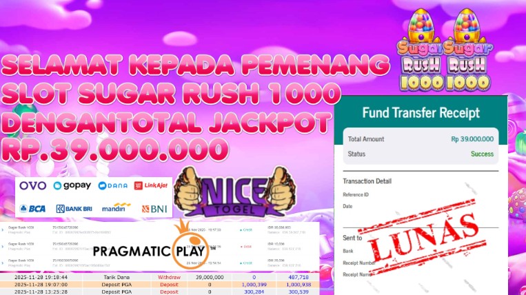 Selamat kepada User id : juju**** Telah berhasil mendapatkan kemenangan besar pada permainan SLOT SLOT SUGAR RUSH 1000 Dengan kemenangan Sebesar Rp. 39.000.000,- Setelah mengisi formulir withdraw dengan kurung waktu hanya 5 – 10 menit pihak NICETOGEL sudah melakukan transfer kepada pemilik Userid dan dana sudah dapat di cairkan oleh pemenang. Bukti pembayaran yang kami berikan merupakan bukti pembayaran yang SAH / VALID yang langung di dapatkan melaui tanda transfer transaksi dari Bank yang di tuju.