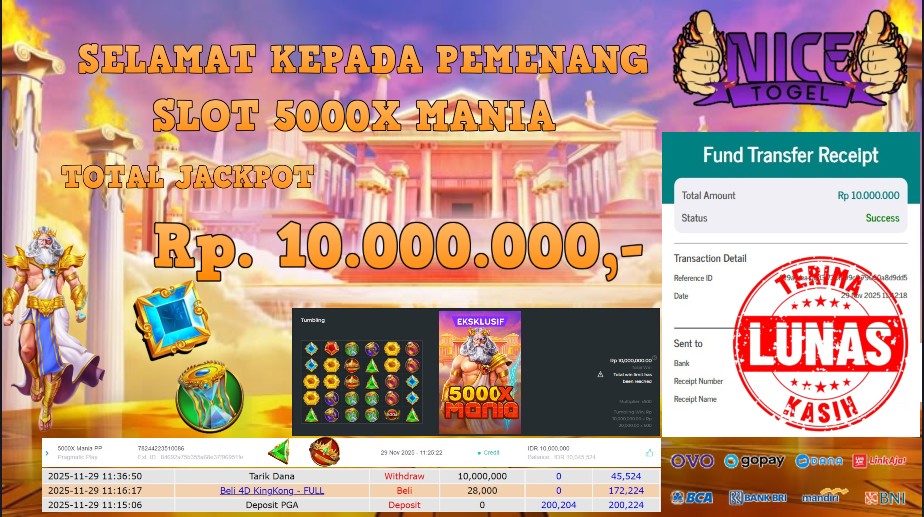 Selamat kepada User id : SIANGNI**** Telah berhasil mendapatkan kemenangan besar pada permainan SLOT 5000X MANIA Dengan kemenangan Sebesar Rp. 10.000.000,- Setelah mengisi formulir withdraw dengan kurung waktu hanya 5 – 10 menit pihak NICETOGEL sudah melakukan transfer kepada pemilik Userid dan dana sudah dapat di cairkan oleh pemenang. Bukti pembayaran yang kami berikan merupakan bukti pembayaran yang SAH / VALID yang langung di dapatkan melaui tanda transfer transaksi dari Bank yang di tuju.