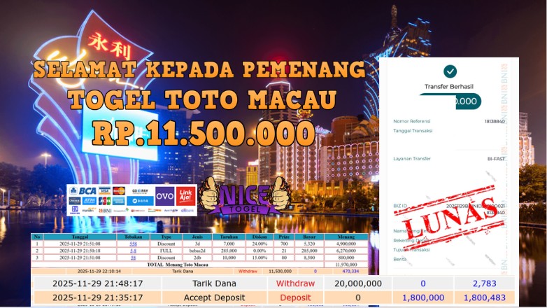 Selamat kepada User id : AJIBN**** Telah berhasil mendapatkan kemenangan besar pada permainan TOGEL TOTO MACAU Dengan kemenangan Sebesar Rp. 11.500.000,- Setelah mengisi formulir withdraw dengan kurung waktu hanya 5 – 10 menit pihak NICETOGEL sudah melakukan transfer kepada pemilik Userid dan dana sudah dapat di cairkan oleh pemenang. Bukti pembayaran yang kami berikan merupakan bukti pembayaran yang SAH / VALID yang langung di dapatkan melaui tanda transfer transaksi dari Bank yang di tuju.