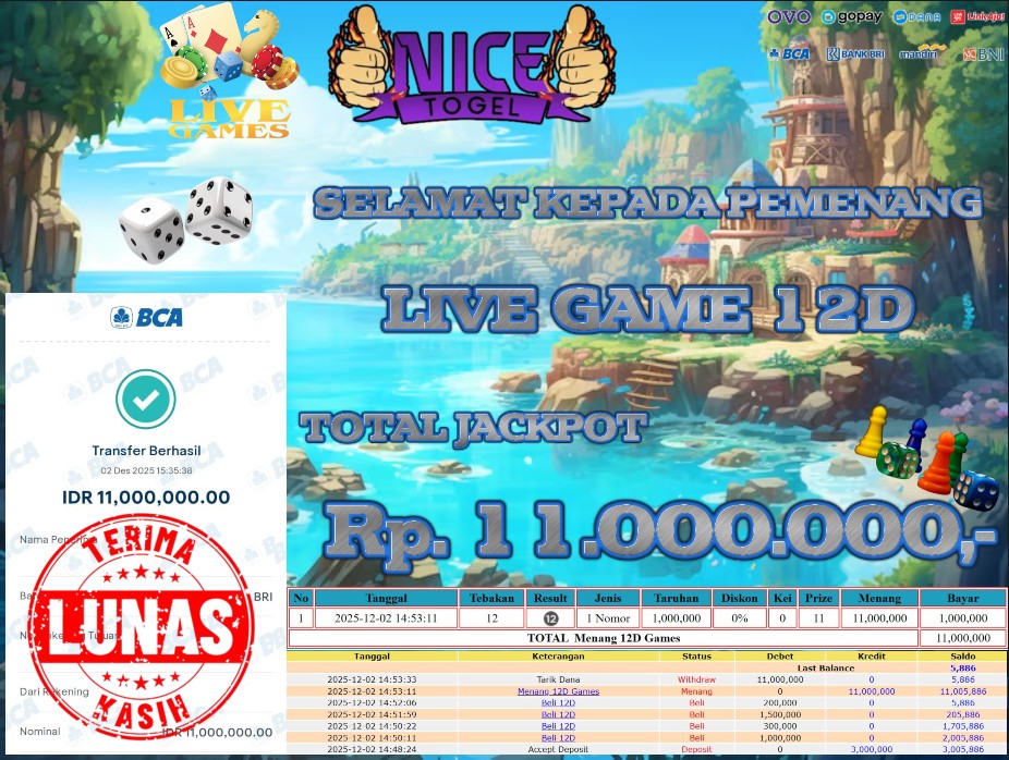 Selamat kepada User id : MIZA**** Telah berhasil mendapatkan kemenangan besar pada permainan LIVEGAME-12D Dengan kemenangan Sebesar Rp 11.000.000,- Setelah mengisi formulir withdraw dengan kurung waktu hanya 5 – 10 menit pihak NICETOGEL sudah melakukan transfer kepada pemilik Userid dan dana sudah dapat di cairkan oleh pemenang. Bukti pembayaran yang kami berikan merupakan bukti pembayaran yang SAH / VALID yang langung di dapatkan melaui tanda transfer transaksi dari Bank yang di tuju.