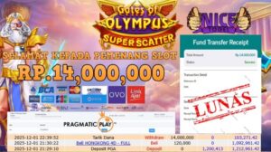 Selamat kepada User id : JEMBER**** Telah berhasil mendapatkan kemenangan besar pada permainan SLOT GATES OF OLYMPUS SUPER SCATTER Dengan kemenangan Sebesar Rp. 14.000.000,- Setelah mengisi formulir withdraw dengan kurung waktu hanya 5 – 10 menit pihak NICETOGEL sudah melakukan transfer kepada pemilik Userid dan dana sudah dapat di cairkan oleh pemenang. Bukti pembayaran yang kami berikan merupakan bukti pembayaran yang SAH / VALID yang langung di dapatkan melaui tanda transfer transaksi dari Bank yang di tuju.