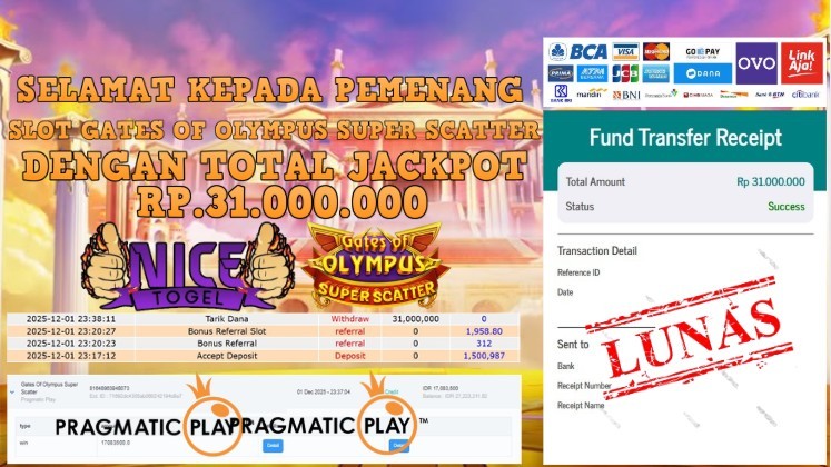 Selamat kepada User id : AMAD**** Telah berhasil mendapatkan kemenangan besar pada permainan SLOT GATES OF OLYMPUS SUPER SCATTER Dengan kemenangan Sebesar Rp. 31.000.000,- Setelah mengisi formulir withdraw dengan kurung waktu hanya 5 – 10 menit pihak NICETOGEL sudah melakukan transfer kepada pemilik Userid dan dana sudah dapat di cairkan oleh pemenang. Bukti pembayaran yang kami berikan merupakan bukti pembayaran yang SAH / VALID yang langung di dapatkan melaui tanda transfer transaksi dari Bank yang di tuju.