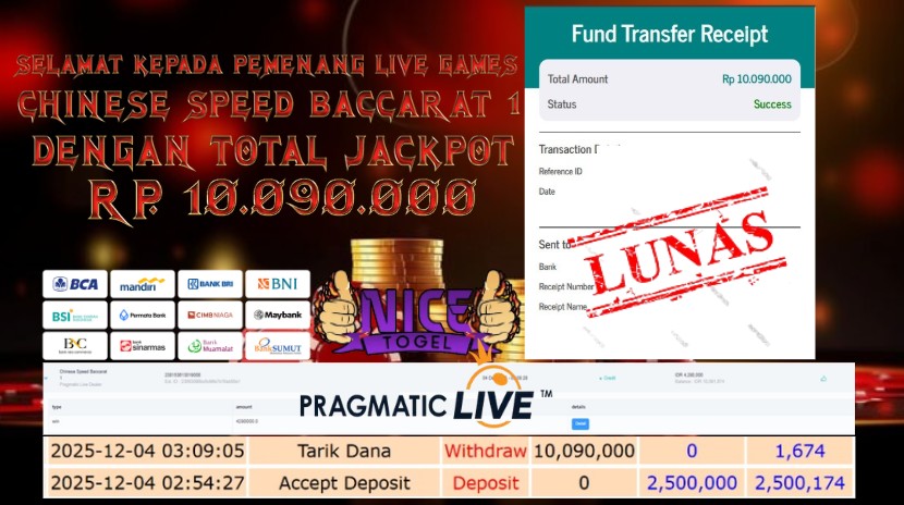 Selamat kepada User id : AZIM**** Telah berhasil mendapatkan kemenangan besar pada permainan LIVEGAME CHINESE SPEED BACCARAT Dengan kemenangan Sebesar Rp 10.009.000,- Setelah mengisi formulir withdraw dengan kurung waktu hanya 5 – 10 menit pihak NICETOGEL sudah melakukan transfer kepada pemilik Userid dan dana sudah dapat di cairkan oleh pemenang. Bukti pembayaran yang kami berikan merupakan bukti pembayaran yang SAH / VALID yang langung di dapatkan melaui tanda transfer transaksi dari Bank yang di tuju.