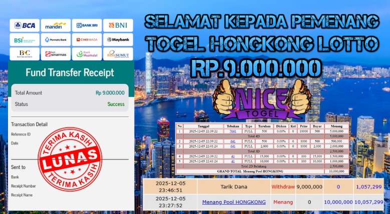 Selamat kepada User id : LABUBU**** Telah berhasil mendapatkan kemenangan besar pada permainan TOGEL HONGKONG LOTTO Dengan kemenangan Sebesar Rp 9.000.000,- Setelah mengisi formulir withdraw dengan kurung waktu hanya 5 – 10 menit pihak NICETOGEL sudah melakukan transfer kepada pemilik Userid dan dana sudah dapat di cairkan oleh pemenang. Bukti pembayaran yang kami berikan merupakan bukti pembayaran yang SAH / VALID yang langung di dapatkan melaui tanda transfer transaksi dari Bank yang di tuju.