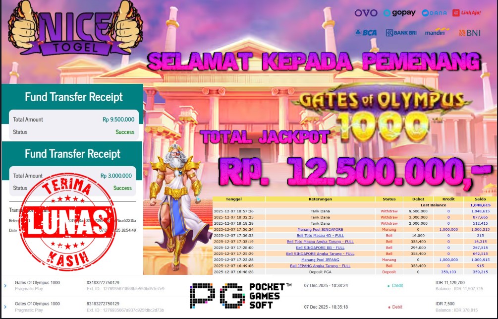 Selamat kepada User id : fina**** Telah berhasil mendapatkan kemenangan besar pada permainan GAME SLOT GATES OF OLYMPUS.1000 Dengan kemenangan Sebesar Rp 12.500.000,- Setelah mengisi formulir withdraw dengan kurung waktu hanya 5 – 10 menit pihak NICETOGEL sudah melakukan transfer kepada pemilik Userid dan dana sudah dapat di cairkan oleh pemenang. Bukti pembayaran yang kami berikan merupakan bukti pembayaran yang SAH / VALID yang langung di dapatkan melaui tanda transfer transaksi dari Bank yang di tuju.