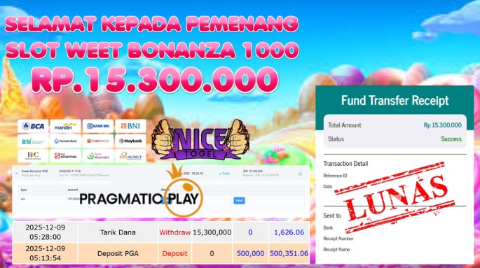 Selamat kepada User id : PEDRO**** Telah berhasil mendapatkan kemenangan besar pada permainan SWEET BONANZA 1000 Dengan kemenangan Sebesar Rp 15.300.000,- Setelah mengisi formulir withdraw dengan kurung waktu hanya 5 – 10 menit pihak NICETOGEL sudah melakukan transfer kepada pemilik Userid dan dana sudah dapat di cairkan oleh pemenang. Bukti pembayaran yang kami berikan merupakan bukti pembayaran yang SAH / VALID yang langung di dapatkan melaui tanda transfer transaksi dari Bank yang di tuju.