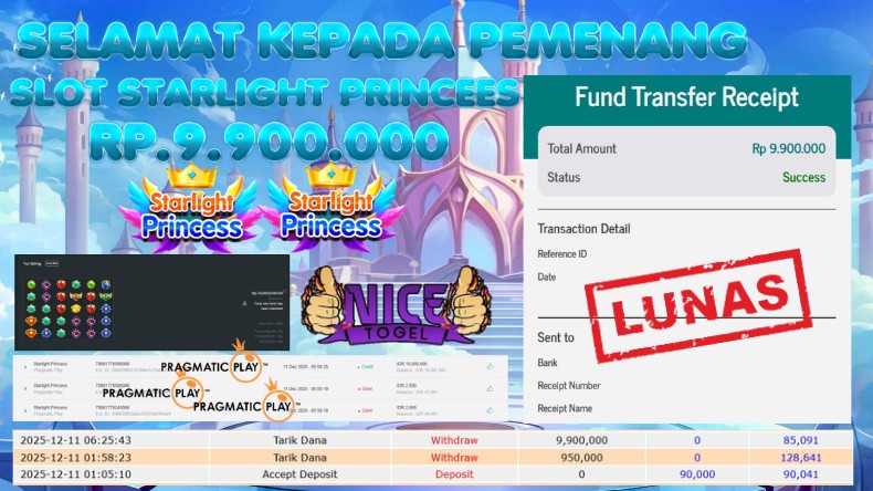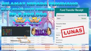 Selamat kepada User id : YUMI**** Telah berhasil mendapatkan kemenangan besar pada permainan SLOT STARLIGHT PRINCEES Dengan kemenangan Sebesar Rp 9.900.000,- Setelah mengisi formulir withdraw dengan kurung waktu hanya 5 – 10 menit pihak NICETOGEL sudah melakukan transfer kepada pemilik Userid dan dana sudah dapat di cairkan oleh pemenang. Bukti pembayaran yang kami berikan merupakan bukti pembayaran yang SAH / VALID yang langung di dapatkan melaui tanda transfer transaksi dari Bank yang di tuju.