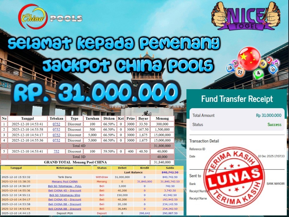Selamat kepada User id : MONEY**** Telah berhasil mendapatkan kemenangan besar pada permainan TOGEL CHINA POOLS Dengan kemenangan Sebesar Rp 31.000.000,- Setelah mengisi formulir withdraw dengan kurung waktu hanya 5 – 10 menit pihak NICETOGEL sudah melakukan transfer kepada pemilik Userid dan dana sudah dapat di cairkan oleh pemenang. Bukti pembayaran yang kami berikan merupakan bukti pembayaran yang SAH / VALID yang langung di dapatkan melaui tanda transfer transaksi dari Bank yang di tuju.