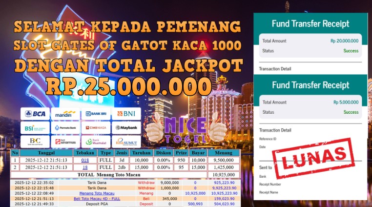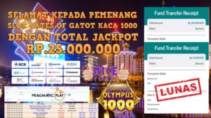 Selamat kepada User id : JUMI**** Telah berhasil mendapatkan kemenangan besar pada permainan SLOT GATES OD GATOT KACA 1000 Dengan kemenangan Sebesar Rp 25.000.000,- Setelah mengisi formulir withdraw dengan kurung waktu hanya 5 – 10 menit pihak NICETOGEL sudah melakukan transfer kepada pemilik Userid dan dana sudah dapat di cairkan oleh pemenang. Bukti pembayaran yang kami berikan merupakan bukti pembayaran yang SAH / VALID yang langung di dapatkan melaui tanda transfer transaksi dari Bank yang di tuju.