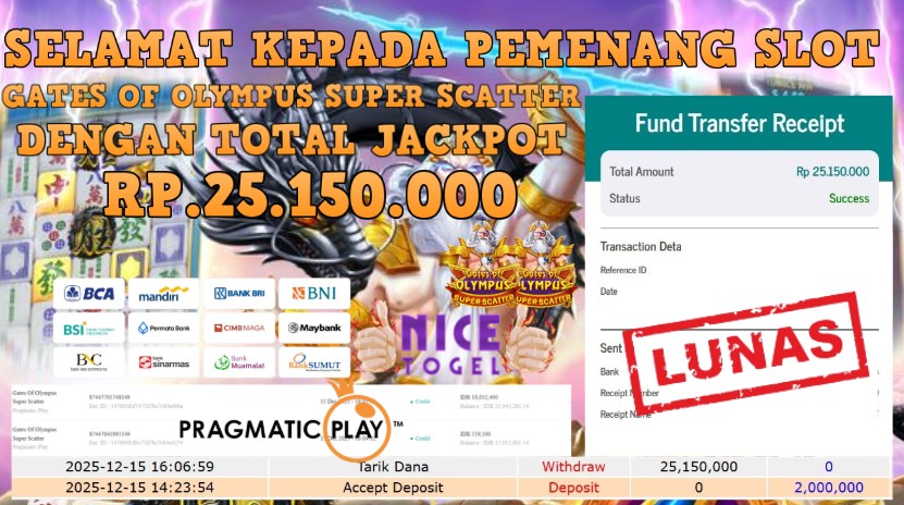 Selamat kepada User id : JONGK**** Telah berhasil mendapatkan kemenangan besar pada permainan SLOT GATES OF OLYMPUS SUPER SCATTER  Dengan kemenangan Sebesar Rp 25.150.000,- Setelah mengisi formulir withdraw dengan kurung waktu hanya 5 – 10 menit pihak NICETOGEL sudah melakukan transfer kepada pemilik Userid dan dana sudah dapat di cairkan oleh pemenang. Bukti pembayaran yang kami berikan merupakan bukti pembayaran yang SAH / VALID yang langung di dapatkan melaui tanda transfer transaksi dari Bank yang di tuju.