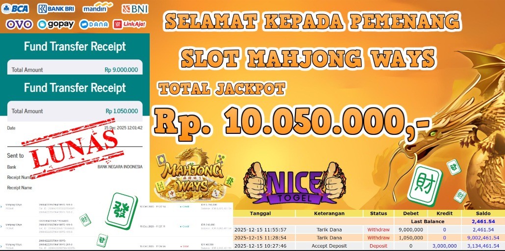 Selamat kepada User id : TEMPE05**** Telah berhasil mendapatkan kemenangan besar pada permainan SLOT MAHJONGWAYS Dengan kemenangan Sebesar Rp 10.050.000,- Setelah mengisi formulir withdraw dengan kurung waktu hanya 5 – 10 menit pihak NICETOGEL sudah melakukan transfer kepada pemilik Userid dan dana sudah dapat di cairkan oleh pemenang. Bukti pembayaran yang kami berikan merupakan bukti pembayaran yang SAH / VALID yang langung di dapatkan melaui tanda transfer transaksi dari Bank yang di tuju.