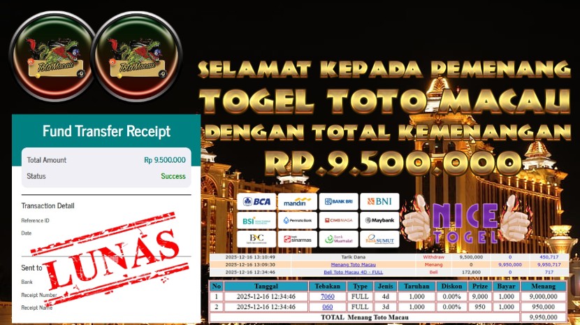 Selamat kepada User id : BONJOR**** Telah berhasil mendapatkan kemenangan besar pada permainan TOGEL TOTO MACAU Dengan kemenangan Sebesar Rp 9.500.000,- Setelah mengisi formulir withdraw dengan kurung waktu hanya 5 – 10 menit pihak NICETOGEL sudah melakukan transfer kepada pemilik Userid dan dana sudah dapat di cairkan oleh pemenang. Bukti pembayaran yang kami berikan merupakan bukti pembayaran yang SAH / VALID yang langung di dapatkan melaui tanda transfer transaksi dari Bank yang di tuju.