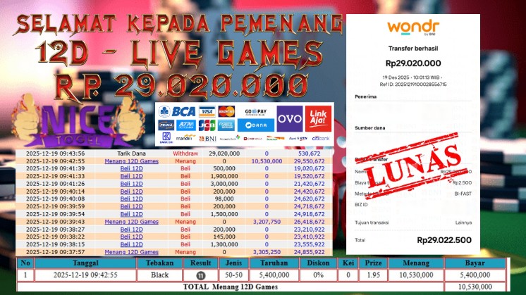 Selamat kepada User id : NUHUN**** Telah berhasil mendapatkan kemenangan besar pada permainan 12D-LIVE GAMES Dengan kemenangan Sebesar Rp 29.020.000,- Setelah mengisi formulir withdraw dengan kurung waktu hanya 5 – 10 menit pihak NICETOGEL sudah melakukan transfer kepada pemilik Userid dan dana sudah dapat di cairkan oleh pemenang. Bukti pembayaran yang kami berikan merupakan bukti pembayaran yang SAH / VALID yang langung di dapatkan melaui tanda transfer transaksi dari Bank yang di tuju.
