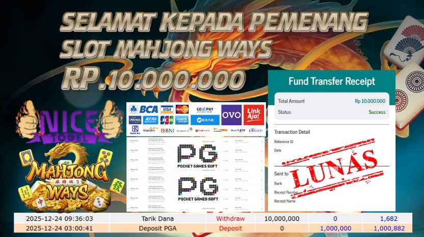Selamat kepada User id : JINR**** Telah berhasil mendapatkan kemenangan besar pada permainan SLOT MAHJONG WAYS Dengan kemenangan Sebesar Rp 10.000.000,- Setelah mengisi formulir withdraw dengan kurung waktu hanya 5 – 10 menit pihak NICETOGEL sudah melakukan transfer kepada pemilik Userid dan dana sudah dapat di cairkan oleh pemenang. Bukti pembayaran yang kami berikan merupakan bukti pembayaran yang SAH / VALID yang langung di dapatkan melaui tanda transfer transaksi dari Bank yang di tuju.