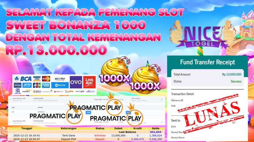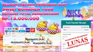 Selamat kepada User id : DAY**** Telah berhasil mendapatkan kemenangan besar pada permainan SLOT SWEET BONANZA.1000 Dengan kemenangan Sebesar Rp 13.000.000,- Setelah mengisi formulir withdraw dengan kurung waktu hanya 5 – 10 menit pihak NICETOGEL sudah melakukan transfer kepada pemilik Userid dan dana sudah dapat di cairkan oleh pemenang. Bukti pembayaran yang kami berikan merupakan bukti pembayaran yang SAH / VALID yang langung di dapatkan melaui tanda transfer transaksi dari Bank yang di tuju.