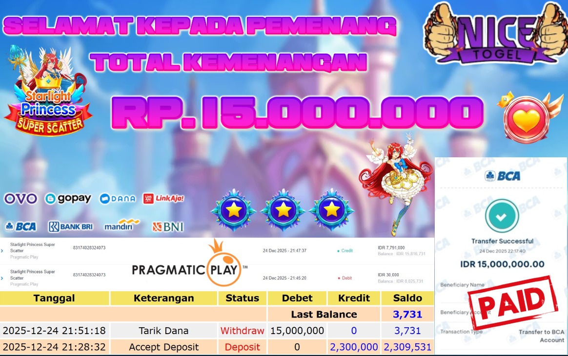 Selamat kepada User id : MAKELI**** Telah berhasil mendapatkan kemenangan besar pada permainan SLOT STARLIGHT PRINCESS SUPER SCATTER Dengan kemenangan Sebesar Rp 15.000.000,- Setelah mengisi formulir withdraw dengan kurung waktu hanya 5 – 10 menit pihak NICETOGEL sudah melakukan transfer kepada pemilik Userid dan dana sudah dapat di cairkan oleh pemenang. Bukti pembayaran yang kami berikan merupakan bukti pembayaran yang SAH / VALID yang langung di dapatkan melaui tanda transfer transaksi dari Bank yang di tuju.