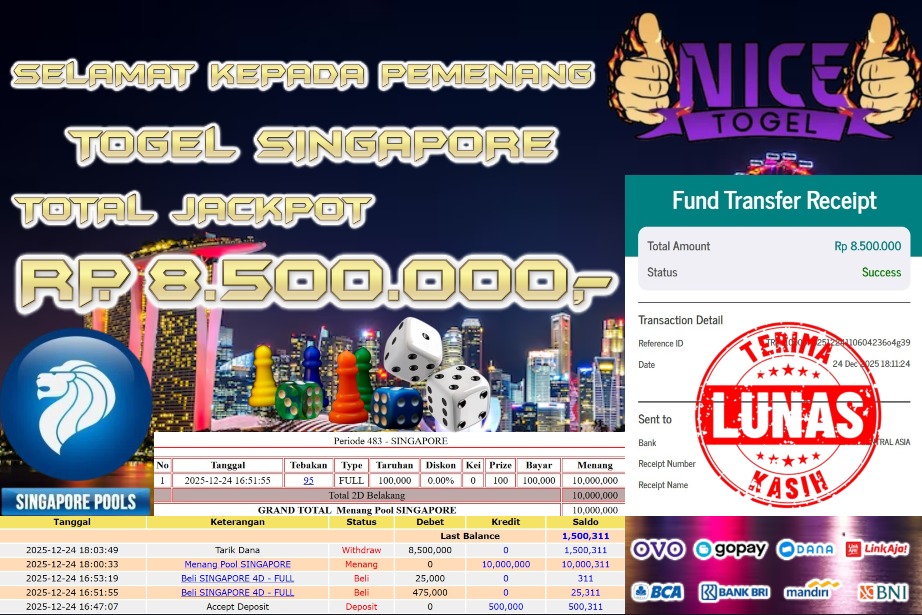 Selamat kepada User id : JKT69**** Telah berhasil mendapatkan kemenangan besar pada permainan TOGEL SINGAPORE POOLS Dengan kemenangan Sebesar Rp 8.500.000,- Setelah mengisi formulir withdraw dengan kurung waktu hanya 5 – 10 menit pihak NICETOGEL sudah melakukan transfer kepada pemilik Userid dan dana sudah dapat di cairkan oleh pemenang. Bukti pembayaran yang kami berikan merupakan bukti pembayaran yang SAH / VALID yang langung di dapatkan melaui tanda transfer transaksi dari Bank yang di tuju.