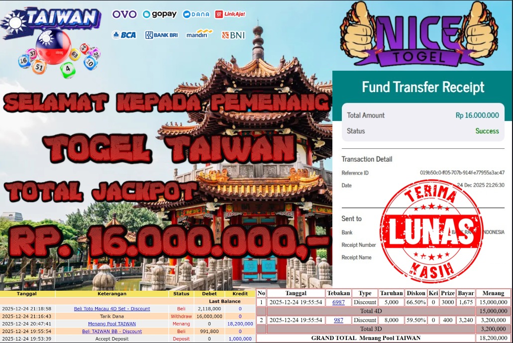Selamat kepada User id : BIBER**** Telah berhasil mendapatkan kemenangan besar pada permainan TOGEL TAIWAN Dengan kemenangan Sebesar Rp 16.000.000,- Setelah mengisi formulir withdraw dengan kurung waktu hanya 5 – 10 menit pihak NICETOGEL sudah melakukan transfer kepada pemilik Userid dan dana sudah dapat di cairkan oleh pemenang. Bukti pembayaran yang kami berikan merupakan bukti pembayaran yang SAH / VALID yang langung di dapatkan melaui tanda transfer transaksi dari Bank yang di tuju.