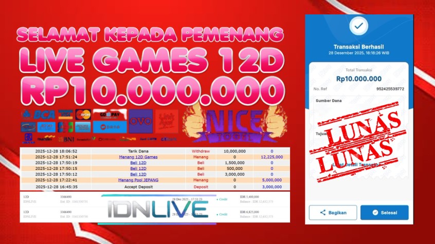 Selamat kepada User id : NAD**** Telah berhasil mendapatkan kemenangan besar pada permainan LIVE GAMES 12D Dengan kemenangan Sebesar Rp 10.000.000,- Setelah mengisi formulir withdraw dengan kurung waktu hanya 5 – 10 menit pihak NICETOGEL sudah melakukan transfer kepada pemilik Userid dan dana sudah dapat di cairkan oleh pemenang. Bukti pembayaran yang kami berikan merupakan bukti pembayaran yang SAH / VALID yang langung di dapatkan melaui tanda transfer transaksi dari Bank yang di tuju.
