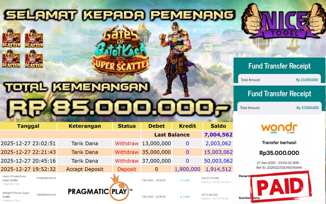 Selamat kepada User id : WAH**** Telah berhasil mendapatkan kemenangan besar pada permainan SLOT GATES OF GATOT KACA SUPER SCATTER Dengan kemenangan Sebesar Rp 85.000.000,- Setelah mengisi formulir withdraw dengan kurung waktu hanya 5 – 10 menit pihak NICETOGEL sudah melakukan transfer kepada pemilik Userid dan dana sudah dapat di cairkan oleh pemenang. Bukti pembayaran yang kami berikan merupakan bukti pembayaran yang SAH / VALID yang langung di dapatkan melaui tanda transfer transaksi dari Bank yang di tuju.