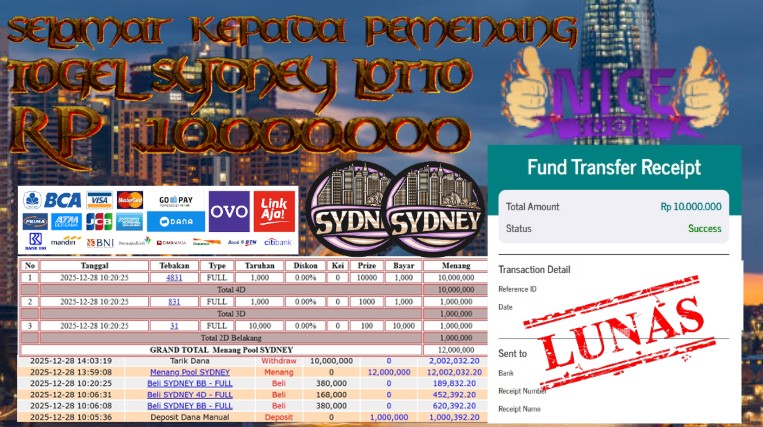 Selamat kepada User id : WILL**** Telah berhasil mendapatkan kemenangan besar pada permainan TOGEL SDNEY LOTTO Dengan kemenangan Sebesar Rp 10.000.000,- Setelah mengisi formulir withdraw dengan kurung waktu hanya 5 – 10 menit pihak NICETOGEL sudah melakukan transfer kepada pemilik Userid dan dana sudah dapat di cairkan oleh pemenang. Bukti pembayaran yang kami berikan merupakan bukti pembayaran yang SAH / VALID yang langung di dapatkan melaui tanda transfer transaksi dari Bank yang di tuju.