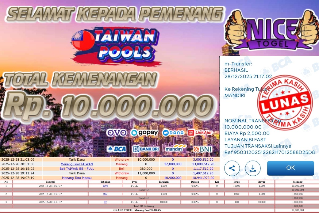 Selamat kepada User id : APR**** Telah berhasil mendapatkan kemenangan besar pada permainan TOGEL TAIWAN Dengan kemenangan Sebesar Rp 10.000.000,- Setelah mengisi formulir withdraw dengan kurung waktu hanya 5 – 10 menit pihak NICETOGEL sudah melakukan transfer kepada pemilik Userid dan dana sudah dapat di cairkan oleh pemenang. Bukti pembayaran yang kami berikan merupakan bukti pembayaran yang SAH / VALID yang langung di dapatkan melaui tanda transfer transaksi dari Bank yang di tuju.