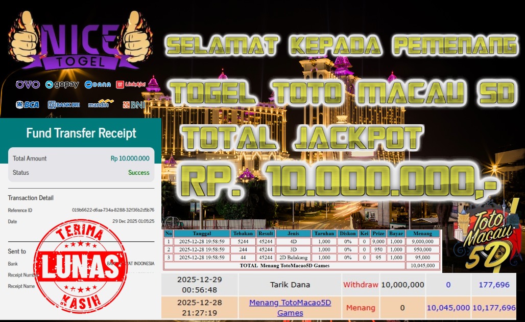 Selamat kepada User id : YUS**** Telah berhasil mendapatkan kemenangan besar pada permainan TOGEL TOTO MACAU 5D Dengan kemenangan Sebesar Rp 10.000.000,- Setelah mengisi formulir withdraw dengan kurung waktu hanya 5 – 10 menit pihak NICETOGEL sudah melakukan transfer kepada pemilik Userid dan dana sudah dapat di cairkan oleh pemenang. Bukti pembayaran yang kami berikan merupakan bukti pembayaran yang SAH / VALID yang langung di dapatkan melaui tanda transfer transaksi dari Bank yang di tuju.