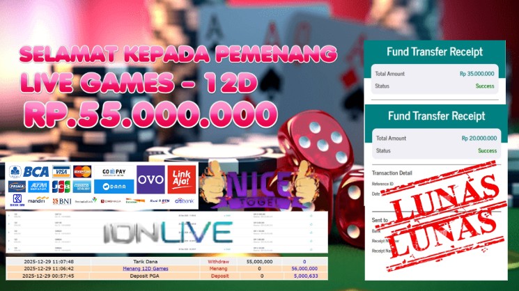 Selamat kepada User id : HUNTERBO**** Telah berhasil mendapatkan kemenangan besar pada permainan LIVE GAMES 12-D Dengan kemenangan Sebesar Rp 55.000.000,- Setelah mengisi formulir withdraw dengan kurung waktu hanya 5 – 10 menit pihak NICETOGEL sudah melakukan transfer kepada pemilik Userid dan dana sudah dapat di cairkan oleh pemenang. Bukti pembayaran yang kami berikan merupakan bukti pembayaran yang SAH / VALID yang langung di dapatkan melaui tanda transfer transaksi dari Bank yang di tuju.