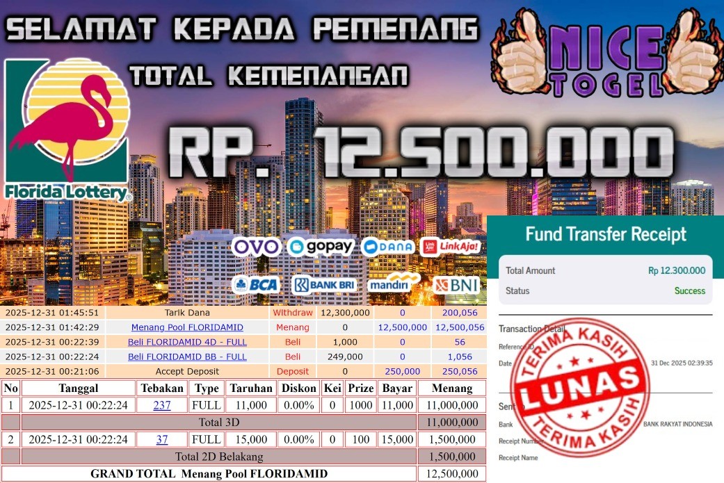 Selamat kepada User id : ABANGKU**** Telah berhasil mendapatkan kemenangan besar pada permainan TOGEL FLORIDAMID Dengan kemenangan Sebesar Rp 12.500.000,- Setelah mengisi formulir withdraw dengan kurung waktu hanya 5 – 10 menit pihak NICETOGEL sudah melakukan transfer kepada pemilik Userid dan dana sudah dapat di cairkan oleh pemenang. Bukti pembayaran yang kami berikan merupakan bukti pembayaran yang SAH / VALID yang langung di dapatkan melaui tanda transfer transaksi dari Bank yang di tuju.