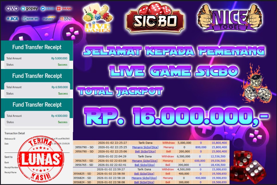Selamat kepada User id : slmttggl**** Telah berhasil mendapatkan kemenangan besar pada permainan LIVEGAME SICBO Dengan kemenangan Sebesar Rp 16.000.000,- Setelah mengisi formulir withdraw dengan kurung waktu hanya 5 – 10 menit pihak NICETOGEL sudah melakukan transfer kepada pemilik Userid dan dana sudah dapat di cairkan oleh pemenang. Bukti pembayaran yang kami berikan merupakan bukti pembayaran yang SAH / VALID yang langung di dapatkan melaui tanda transfer transaksi dari Bank yang di tuju.