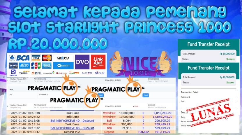 Selamat kepada User id : NORNUS**** Telah berhasil mendapatkan kemenangan besar pada permainan SLOT STARLIGHT PRINCES.1000 Dengan kemenangan Sebesar Rp 20.000.000,- Setelah mengisi formulir withdraw dengan kurung waktu hanya 5 – 10 menit pihak NICETOGEL sudah melakukan transfer kepada pemilik Userid dan dana sudah dapat di cairkan oleh pemenang. Bukti pembayaran yang kami berikan merupakan bukti pembayaran yang SAH / VALID yang langung di dapatkan melaui tanda transfer transaksi dari Bank yang di tuju.