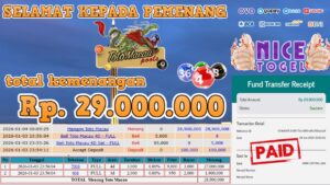 Selamat kepada User id : WARD**** Telah berhasil mendapatkan kemenangan besar pada permainan TOGEL TOTO MACAU Dengan kemenangan Sebesar Rp. 29.000.000,- Setelah mengisi formulir withdraw dengan kurung waktu hanya 5 – 10 menit pihak NICETOGEL sudah melakukan transfer kepada pemilik Userid dan dana sudah dapat di cairkan oleh pemenang. Bukti pembayaran yang kami berikan merupakan bukti pembayaran yang SAH / VALID yang langung di dapatkan melaui tanda transfer transaksi dari Bank yang di tuju.