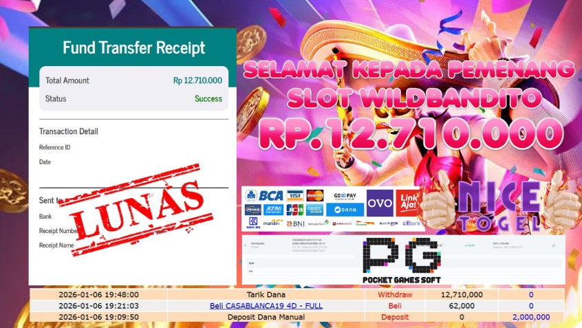 Selamat kepada User id : DED**** Telah berhasil mendapatkan kemenangan besar pada permainan SLOT WILD BANDITO Dengan kemenangan Sebesar Rp. 12.710.000,- Setelah mengisi formulir withdraw dengan kurung waktu hanya 5 – 10 menit pihak NICETOGEL sudah melakukan transfer kepada pemilik Userid dan dana sudah dapat di cairkan oleh pemenang. Bukti pembayaran yang kami berikan merupakan bukti pembayaran yang SAH / VALID yang langung di dapatkan melaui tanda transfer transaksi dari Bank yang di tuju.
