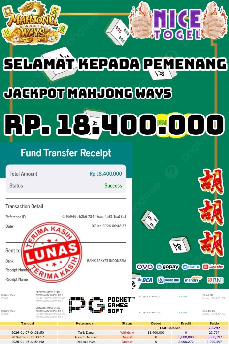 Selamat kepada User id : WILD**** Telah berhasil mendapatkan kemenangan besar pada permainan SLOT MAHJONG WAYS Dengan kemenangan Sebesar Rp. 18.400.000,- Setelah mengisi formulir withdraw dengan kurung waktu hanya 5 – 10 menit pihak NICETOGEL sudah melakukan transfer kepada pemilik Userid dan dana sudah dapat di cairkan oleh pemenang. Bukti pembayaran yang kami berikan merupakan bukti pembayaran yang SAH / VALID yang langung di dapatkan melaui tanda transfer transaksi dari Bank yang di tuju.
