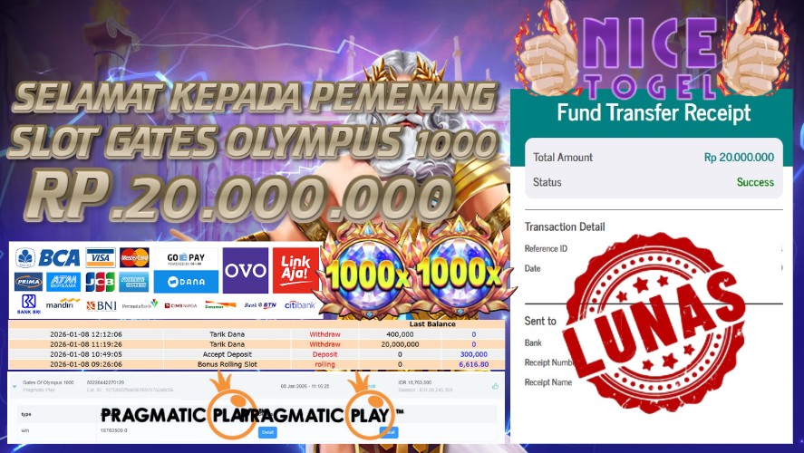 Selamat kepada User id : JAYA**** Telah berhasil mendapatkan kemenangan besar pada permainan SLOT GATES OF OLYMPUS 1000 Dengan kemenangan Sebesar Rp. 20.000.000,- Setelah mengisi formulir withdraw dengan kurung waktu hanya 5 – 10 menit pihak NICETOGEL sudah melakukan transfer kepada pemilik Userid dan dana sudah dapat di cairkan oleh pemenang. Bukti pembayaran yang kami berikan merupakan bukti pembayaran yang SAH / VALID yang langung di dapatkan melaui tanda transfer transaksi dari Bank yang di tuju.