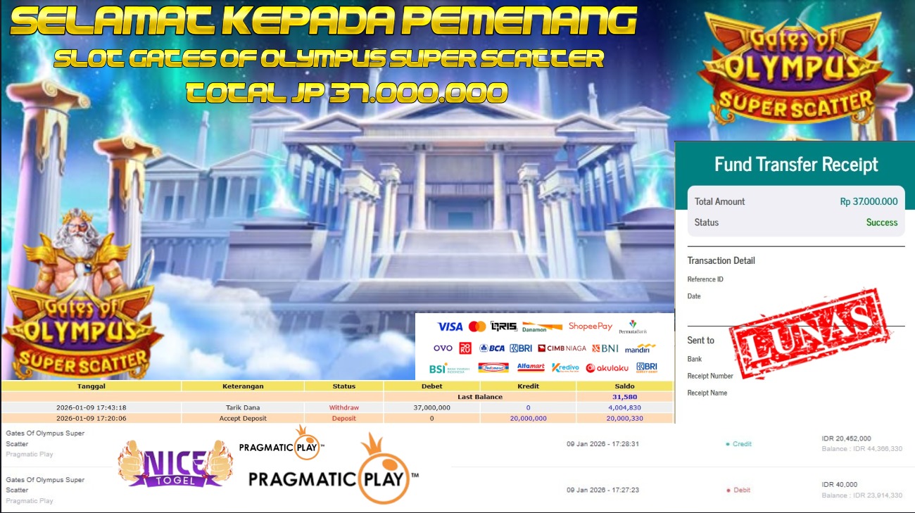 Selamat kepada User id : JAYA**** Telah berhasil mendapatkan kemenangan besar pada permainan SLOT GATES OF OLYMPUS SUPER SCATTER Dengan kemenangan Sebesar Rp 37.000.000,- Setelah mengisi formulir withdraw dengan kurung waktu hanya 5 – 10 menit pihak NICETOGEL sudah melakukan transfer kepada pemilik Userid dan dana sudah dapat di cairkan oleh pemenang. Bukti pembayaran yang kami berikan merupakan bukti pembayaran yang SAH / VALID yang langung di dapatkan melaui tanda transfer transaksi dari Bank yang di tuju.