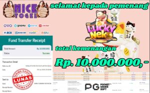 Selamat kepada User id : BOXOF**** Telah berhasil mendapatkan kemenangan besar pada permainan SLOT LUCKY-NEKO Dengan kemenangan Sebesar Rp 10.000.000,- Setelah mengisi formulir withdraw dengan kurung waktu hanya 5 – 10 menit pihak NICETOGEL sudah melakukan transfer kepada pemilik Userid dan dana sudah dapat di cairkan oleh pemenang. Bukti pembayaran yang kami berikan merupakan bukti pembayaran yang SAH / VALID yang langung di dapatkan melaui tanda transfer transaksi dari Bank yang di tuju.