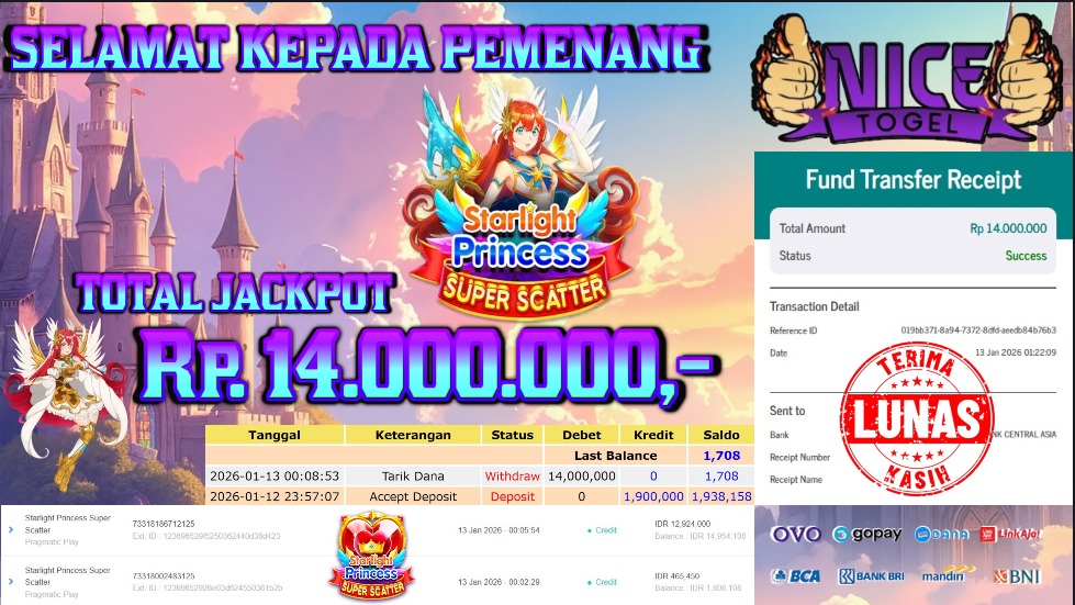 Selamat kepada User id : RAY**** Telah berhasil mendapatkan kemenangan besar pada permainan SLOT STARLIGHT PRINCESS SUPER SCATTER Dengan kemenangan Sebesar Rp. 14.000.000,- Setelah mengisi formulir withdraw dengan kurung waktu hanya 5 – 10 menit pihak NICETOGEL sudah melakukan transfer kepada pemilik Userid dan dana sudah dapat di cairkan oleh pemenang. Bukti pembayaran yang kami berikan merupakan bukti pembayaran yang SAH / VALID yang langung di dapatkan melaui tanda transfer transaksi dari Bank yang di tuju.