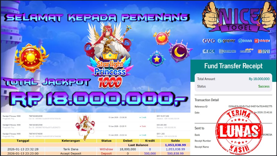 Selamat kepada User id : FAMS**** Telah berhasil mendapatkan kemenangan besar pada permainan SLOT STARLIGHT PRINCESS 1000 Dengan kemenangan Sebesar Rp. 18.000.000,- Setelah mengisi formulir withdraw dengan kurung waktu hanya 5 – 10 menit pihak NICETOGEL sudah melakukan transfer kepada pemilik Userid dan dana sudah dapat di cairkan oleh pemenang. Bukti pembayaran yang kami berikan merupakan bukti pembayaran yang SAH / VALID yang langung di dapatkan melaui tanda transfer transaksi dari Bank yang di tuju.